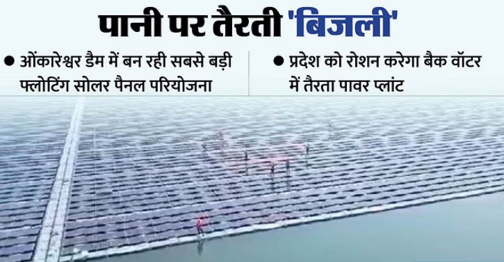 मध्यप्रदेश के खंडवा जिले में स्थित ओंकारेश्वर डैम के बैकवॉटर में एशिया की सबसे बड़ी फ्लोटिंग सोलर पैनल परियोजना आकार ले रही है। यहां पानी पर तैरते सोलर पावर प्लांट की बिजली लाइन ट्रायल गुरुवार को पूरा हो गया। इसके बाद यहां स्थित 100 मेगावॉट क्षमता का पहला पानी पर तैरता ट्रांसफॉर्मर चार्ज होने के बाद ठीक से काम भी करने लगा है। सफल ट्रायल के बाद इससे केलवाखुर्द ग्राम के पास बैकवॉटर में स्थित एम्प कंपनी के पावर प्लांट तक सफलता पूर्वक बिजली सप्लाई पहुंच गई है।