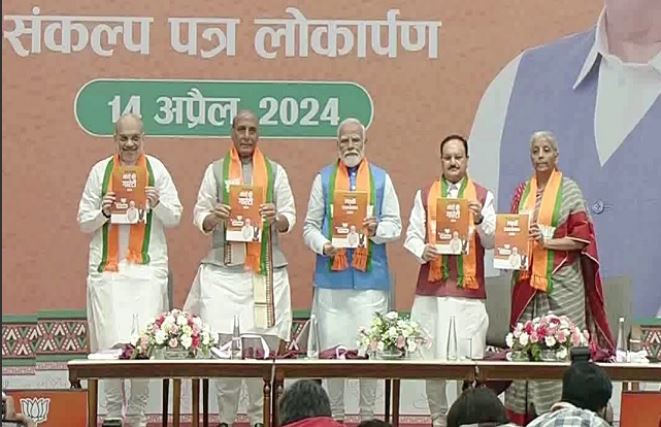 भाजपा ने रविवार को प्रधानमंत्री मोदी, पार्टी प्रमुख जेपी नड्डा, केंद्रीय गृह मंत्री अमित शाह, वित्त मंत्री निर्मला सीतारमण और रक्षा मंत्री राजनाथ की उपस्थिति में अपना चुनावी घोषणापत्र- ‘संकल्प पत्र’ जारी किया। घोषणापत्र के लॉन्च से पहले रक्षा मंत्री राजनाथ सिंह ने राष्ट्रीय राजधानी में पार्टी मुख्यालय में नेताओं की सभा को संबोधित किया और कहा बीजेपी ने अपने वादों को पूरा करके लोगों के बीच विश्वसनीयता अर्जित की है और पीएम मोदी की गारंटी को 24 कैरेट सोने की तरह देखा जाता है।