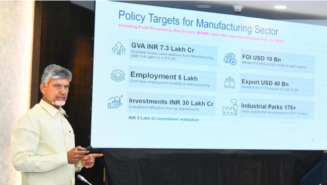 सीएम नायडू ने कहा कि राज्य को 10 बिलियन अमेरिकी डॉलर का प्रत्यक्ष विदेशी निवेश मिलने की भी उम्मीद है। उन्होंने आगे कहा कि विनिर्माण क्षेत्र से सकल मूल्य संवर्धन (जीवीए) जो 2024 में 3.4 लाख करोड़ रुपये आंका गया है, उसे 2029 तक 7.3 लाख करोड़ रुपये तक ले जाया जाएगा, जिससे पांच लाख नई नौकरियां पैदा होंगी। मुख्यमंत्री नायडू ने एपी औद्योगिक विकास नीति 4.0, एपी एमएसएमई और उद्यमिता विकास नीति 4.0, एपी खाद्य प्रसंस्करण नीति 4.0, एपी इलेक्ट्रॉनिक्स नीति 4.0, एपी औद्योगिक पार्क नीति 4.0 और एपी एकीकृत स्वच्छ ऊर्जा नीति 4.0 के रूप में छह नीतियों की घोषणा की।