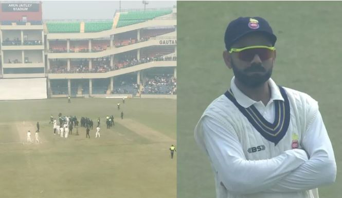 मैच के पहले दिन स्टेडियम के बाहर इतने फैंस थे कि भगदड़ मच गई थी। पहले दिन तो कोहली की बैटिंग नहीं आई थी। दूसरे दिन वह बल्लेबाजी करने उतरे, लेकिन सिर्फ छह रन बनाकर आउट हो गए। हिमांशु सांगवान ने उन्हें क्लीन बोल्ड कर दिया।