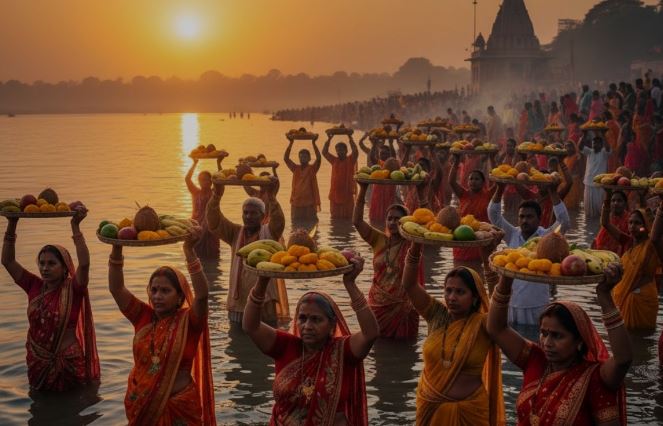 - संध्या अर्घ्य (तीसरा दिन): सूर्यास्त के समय नदी या जलाशय के किनारे खड़े होकर सूर्य देव को जल अर्पित किया जाता है। इस दिन भी निर्जला उपवास रहता है।