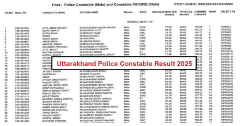 उत्तराखंड अधीनस्थ सेवा चयन आयोग (UKSSSC) की ओर से पुलिस कॉन्स्टेबल 2025 का रिजल्ट घोषित कर दिया गया है। रिजल्ट मेरिट लिस्ट के रूप में जारी किया गया है जिसमें सफल उम्मीदवारों के रोल नंबर, नाम, पिता का नाम, जेंडर, कैटेगरी, लिखित परीक्षा व फिजिकल में प्राप्त अंकों के साथ ही रैंक दी गई है। अभ्यर्थी मेरिट लिस्ट यूकेएसएसएससी की ऑफिशियल वेबसाइट sssc.uk.gov.in पर जाकर या नीचे दिए गए डायरेक्ट PDF लिंक पर क्लिक करके डाउनलोड कर सकते हैं।