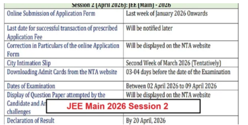 जेईई मेन सेशन 2 में आवेदन करने वाले उम्मीदवारों के लिए परीक्षा का आयोजन 2 से 9 अप्रैल 2026 तक करवाया जायेगा। एग्जाम के लिए एग्जाम सिटी स्लिप परीक्षा तिथि से 10 दिन पूर्व एवं एडमिट कार्ड 3 से 4 दिन पूर्व जारी होंगे। परीक्षा संपन्न होने के बाद रिजल्ट 20 अप्रैल 2026 को घोषित कर दिया जायेगा।