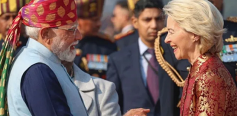 मुख्य अतिथि के रूप में यूरोपीय संघ (ईयू) की प्रमुख उर्सुला ने सोमवार को 77वें गणतंत्र दिवस समारोह में एक गहरे लाल और सुनहरे रेशमी ब्रोकेड का बंद गले का जैकेट पहना था। जब वह राष्ट्रपति द्रौपदी मुर्मु के साथ बग्गी से उतरीं, तो उनकी पोशाक पर फूलों के जाल वाली जरी की डिजाइन सुनहरी धूप में हल्की चमक बिखेर रही थी।